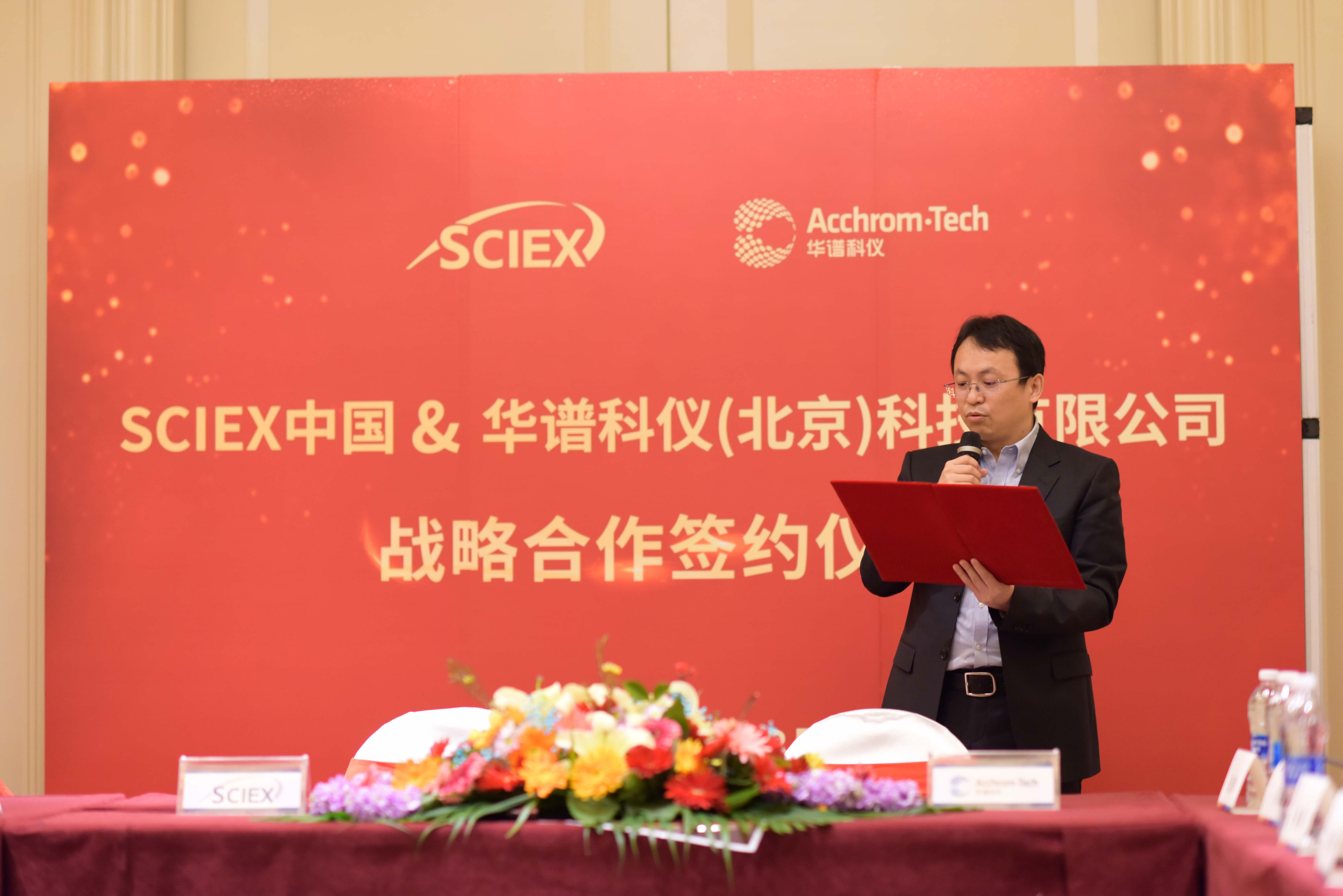 簽約儀式特邀中國科學院大連化學物理研究所研究員梁鑫淼先生為見證嘉賓;SCIEX中國總經理桑小亮先生、華譜科儀董事長王利春先生及雙方各相關部門負責人共同出席本活動。