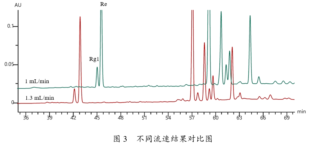 色譜分析中我們習(xí)慣根據(jù)K'改變后,化合物間相對(duì)保留行為是否改變將化合物分為“常規(guī)樣品”和“非常規(guī)樣品”。其中常規(guī)樣品是K'改變后,相對(duì)保留行為不發(fā)生改變,非常規(guī)樣品剛好相反。我們?cè)倩氐竭@個(gè)實(shí)驗(yàn),發(fā)現(xiàn)色譜柱長(zhǎng)度從150mm變?yōu)?50mm后,Rg1和Re分離度變差,說明Rg1和Re屬于非常規(guī)樣品范疇。為了驗(yàn)證這一結(jié)論,我們?cè)O(shè)計(jì)實(shí)驗(yàn),改變流速F,考察K'減小后Rg1和Re分離度是否也會(huì)變差。結(jié)果如圖3所示,我們發(fā)現(xiàn)1mL/min流速下分離度小于1.3mL/min,與色譜柱長(zhǎng)度改變后得到的分離度變化趨勢(shì)一致。