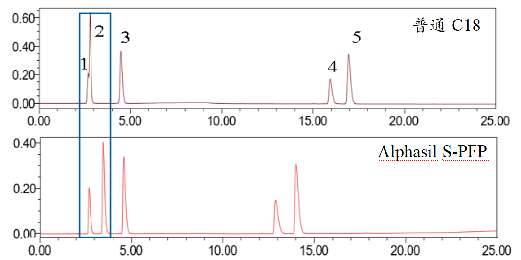 通過查詢結構可知,二者互為芳香族位置異構體,所以PFP柱是分離該類化合物的理想選擇。但實際結果中PFP柱的分離反而更差,這是什么原因?