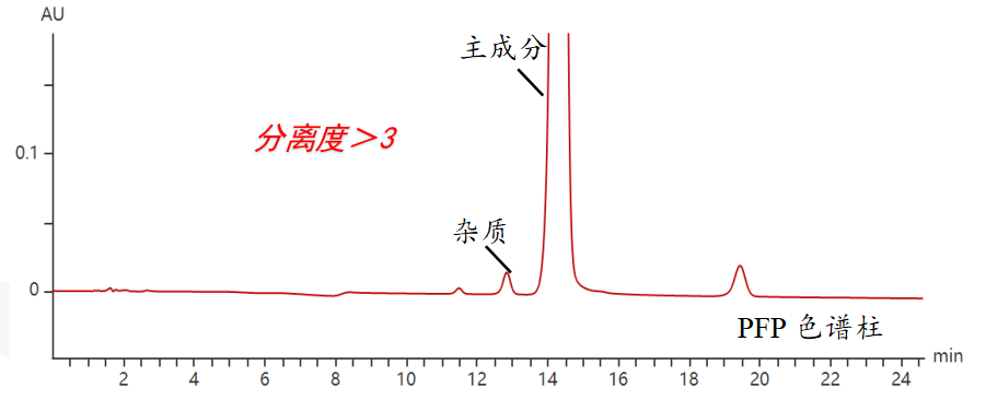 當我們把乙腈更換為甲醇后,甲醇的羥基與PFP固定相的氟原子形成互補作用,可增強對位置異構體的區分。結果主成分與雜質的分離度達到了3以上,遠遠滿足了檢測需求。